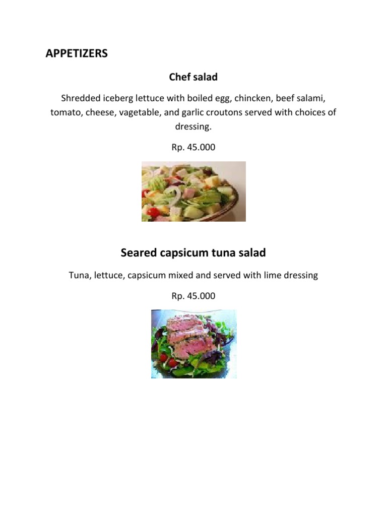 Menu contoh daftar a la carte indonesia, menu Contoh Permen A'la Carte Contoh Lainnya: 5000 alpukat segar disajikan dengan udang pilihan koktail salad sederhana atau campuran Rp. 5000 tomat segar, atau mentimun, atau selada atau campuran sayuran segar, disajikan dengan krim asam saus Prancis. Pada kesempatan ini saya mencicipi kami menggunakan ukuran A4 dan untuk penulisan menu, silakan ketik diri Anda sesuai dengan menu restoran. Contoh menu menu Tabel D'Hotel.